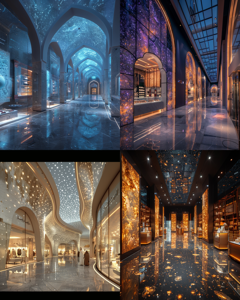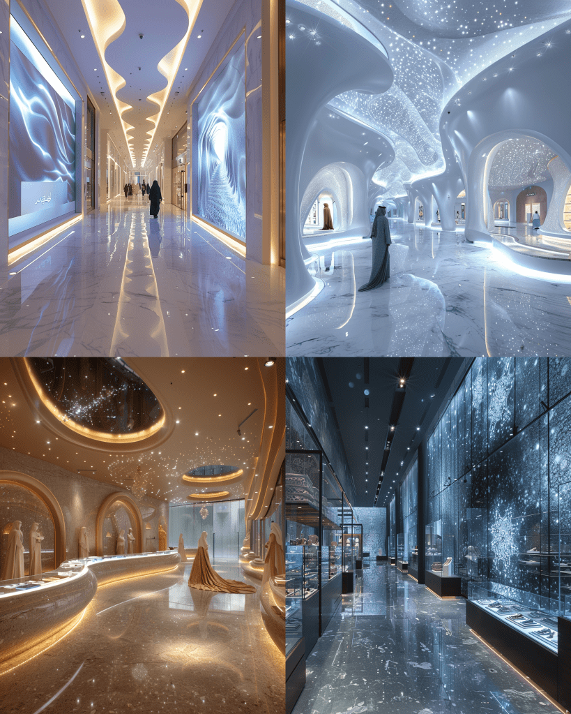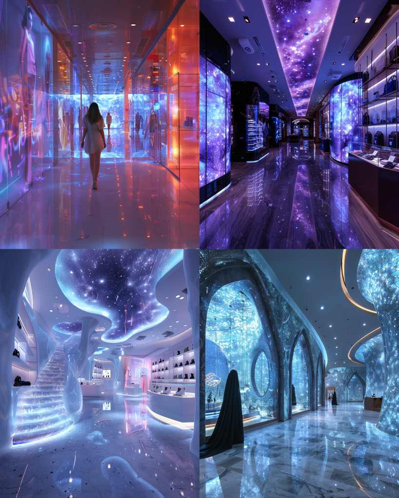 envision a showroom designed for a cloth wear store in a mall in Qatar that is designed based on media architecture having digital LED screens on walls and on the ceiling LED lights without screens to provide the customer with a digital futuristic experience, using media that is related to the products on the screenss and different spaces or zones inside the store. The idea is to create an experience architecture with a digital showroom. –ar 4:5 –v 6.0 –style raw –s 500 –
