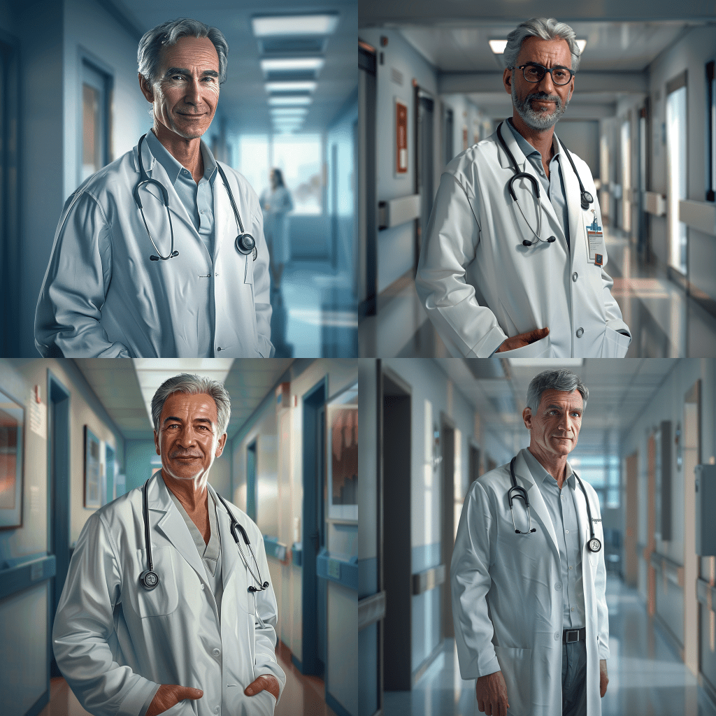 Create a photorealistic image of a middle-aged doctor, wearing a white lab coat and a stethoscope around his neck, with a friendly and approachable expression, standing in a hospital corridor with a confident posture, showing his entire body from head to toe, with a subtle smile and a sense of professionalism.