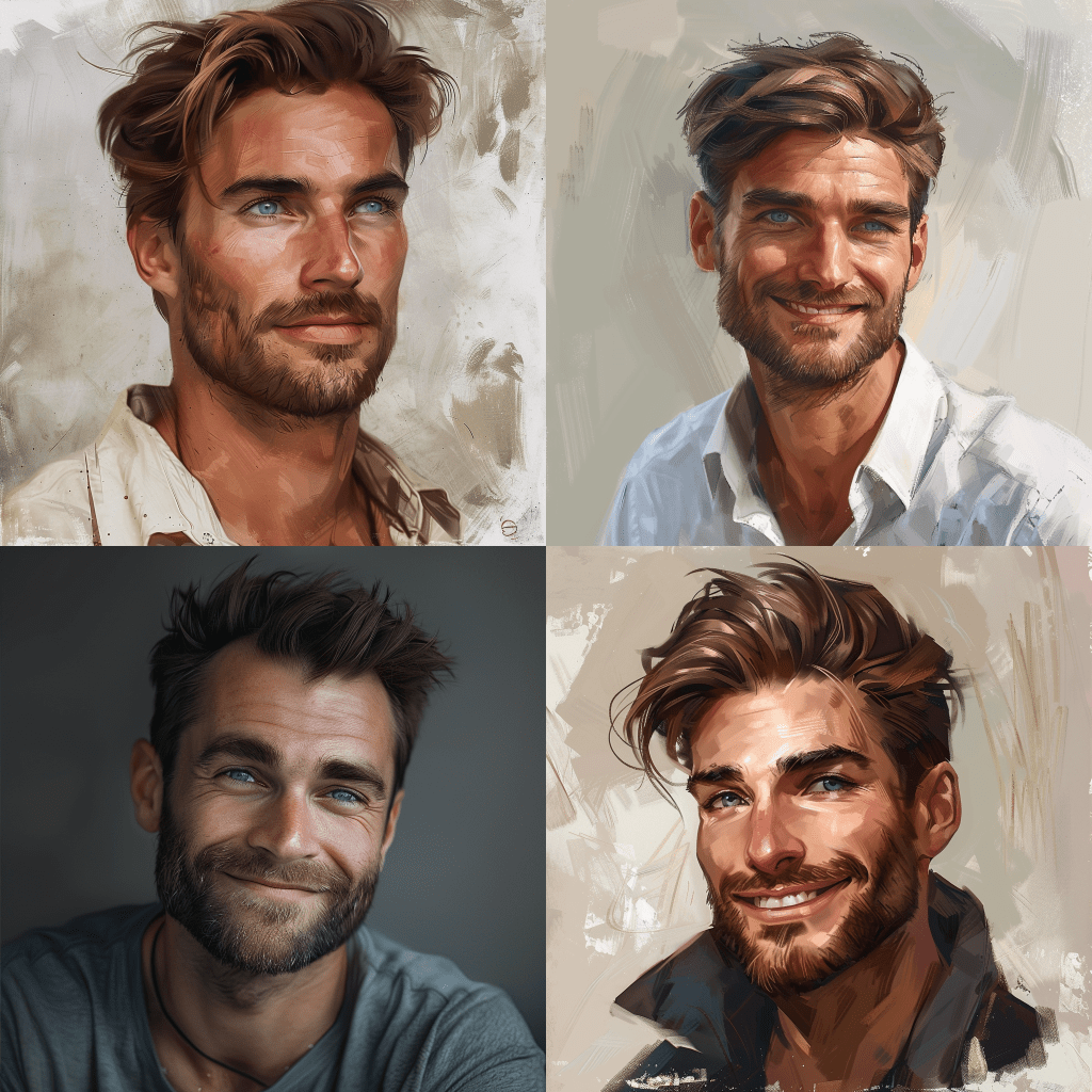 “Create a stunning portrait of a man in his mid-30s with a strong jawline, piercing blue eyes, and a charming smile, sporting a stylishly messy brown hair and a short, neatly trimmed beard, with a warm and inviting expression, perfect for a friendly AI assistant.”