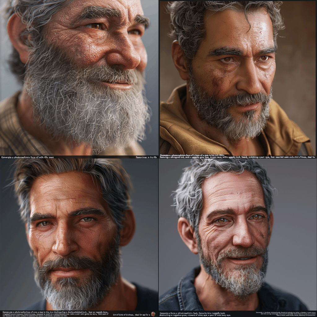 “Generate a photorealistic face of a man in his 40s with a distinguished look, featuring a ruggedly handsome face, a distinctive gray beard, and a pair of wise, brown eyes that seem to tell a story, with a gentle smile and a hint of kindness, ideal for a wise and trustworthy mentor figure.”